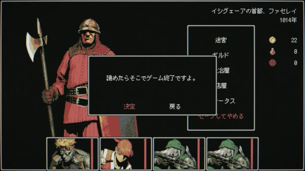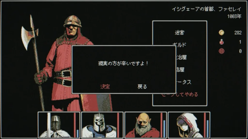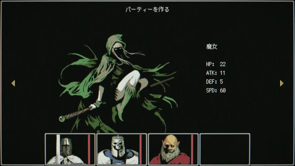 ゲームを開始すると、まずはパーティを組むように指示されます。選べるクラスは8種類で、ステータスや見た目などを見比べながら、好きな組み合わせを設定しよう。なお、ここで選んだメンバーは、後から変更ができません。セーブスロットはひとつしかないので、パーティを組み直したい場合は、ゲームを始めからやり直す必要があります。