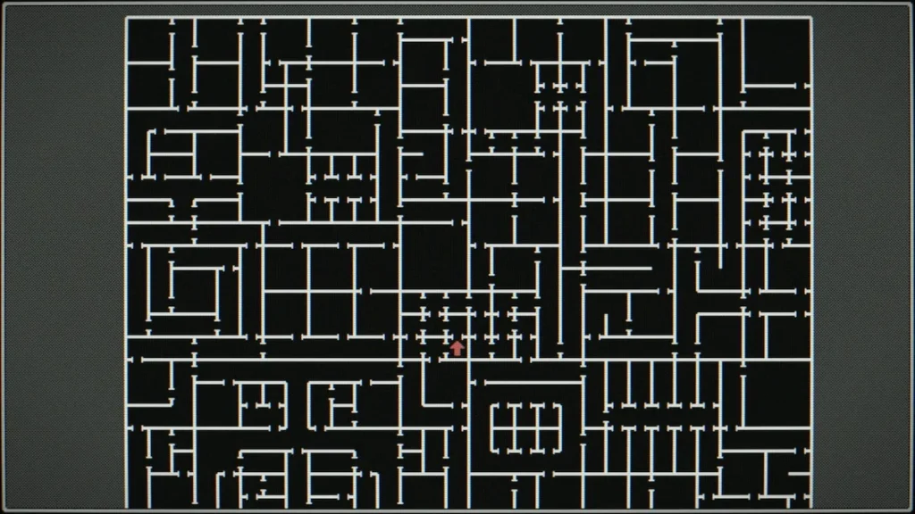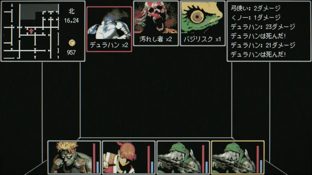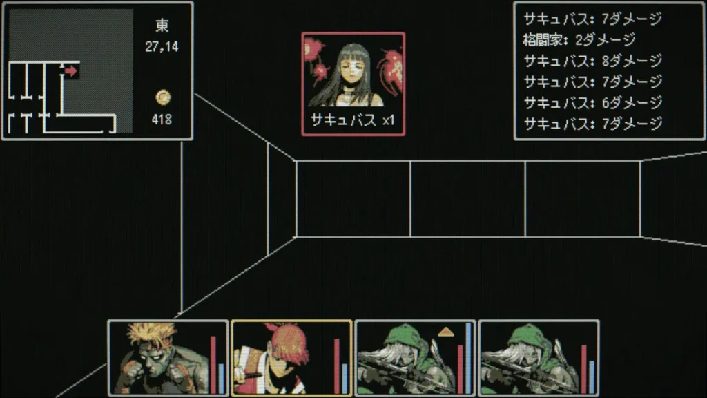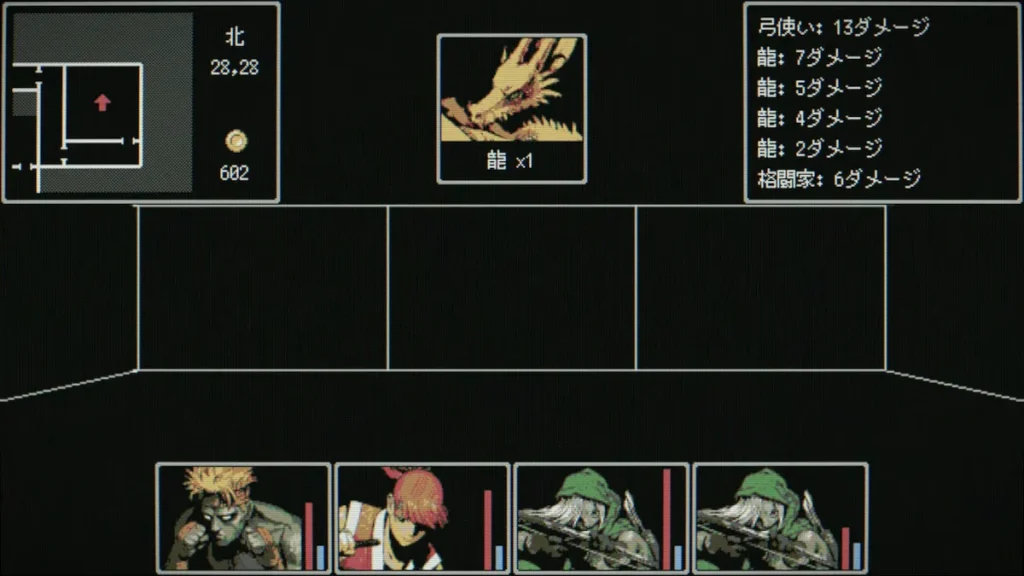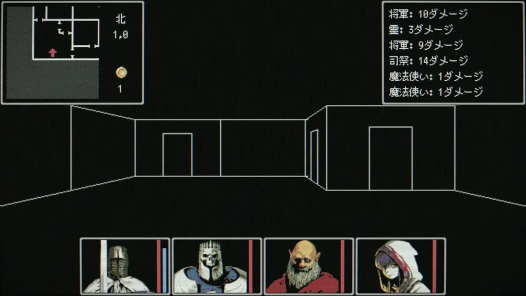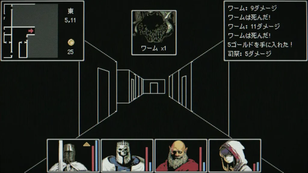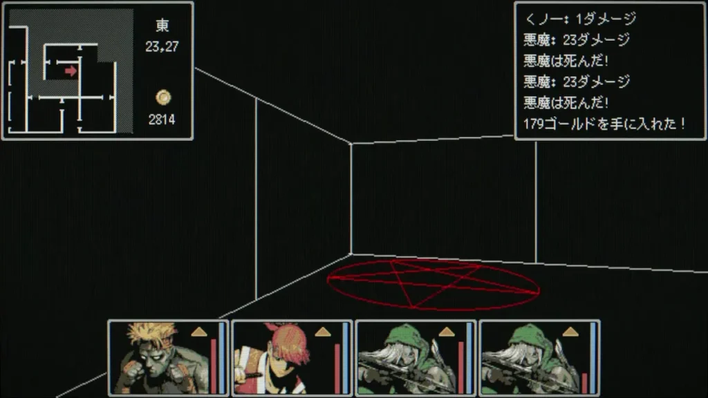 迷宮は、ワイヤーフレームのダンジョンです。今作の地図は、なんとオートマッピングに対応しました。さらには小窓のミニマップ表示も実装されています。カニ歩きにも対応し、探索シーンのユーザビリティは、昨今のDRPGと遜色ありません。