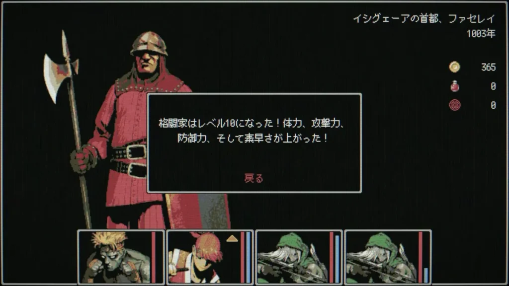 キャラクターの横に表示されている、赤いバーはヒットポイント、青いバーは経験値を表しています。経験値が溜まったら、首都に戻って「ギルド」でレベルアップしよう。レベルアップには、現在のレベルに応じたゴールドを消費します。馬小屋はないのじゃ。また、それぞれのキャラクターには、現在のレベルアップに必要な分以上の経験値は蓄積しません。この仕組みは、拠点とダンジョンを往復させる理由として機能しています。