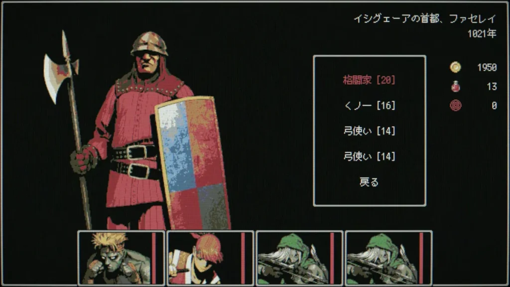 「店屋」では、2種類の消費アイテムが購入できます。「薬」は、キャラクターのHPがゼロになったときに自動的に消費され、HP半分程度で復活します。「転送の書」は、ダンジョン内で使用すると拠点に帰還できるのだと思います。アイテムの値段は買うごとに上がっていきます。所持数について、スタックはできますが、上限があるのかはわかりませんでした。