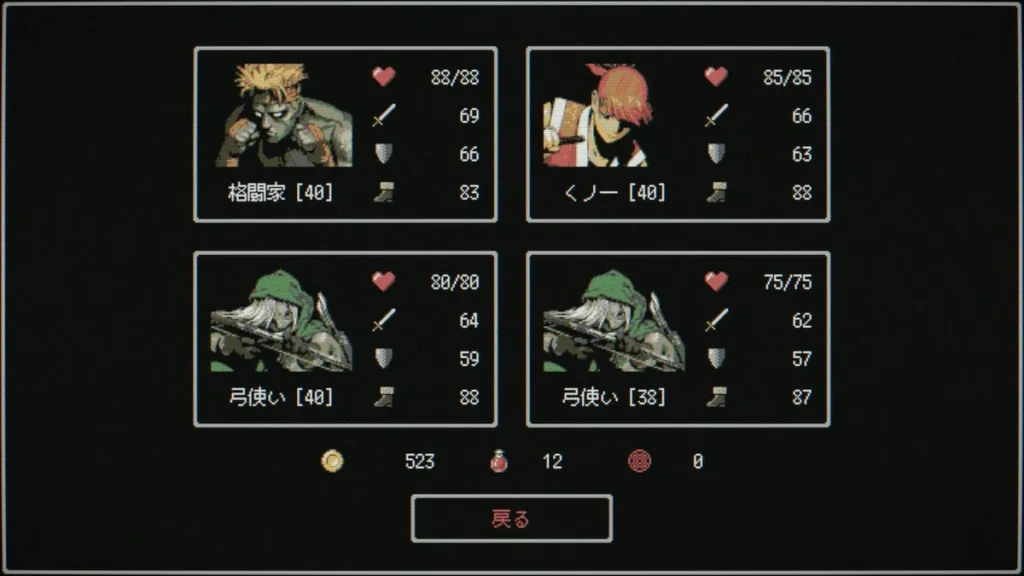 とすると、この手のゲームは先手必勝法が最適解なのでは?と思い立って、パーティを作り直してみたものの、どうなんでしょうね。どのキャラクターもステータスの上がり幅は1ずつで固定だし、どこまでいっても初期ステータスの差しかないので適当でも大差がなかった気はします。