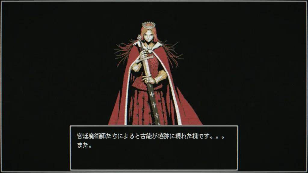 パーティを作成すると、女王からの簡単なイントロダクションの後、冒険が始まります。以降のゲームシーンとしては、首都(拠点)と古代遺跡(迷宮)を行き来しながら進めていく、毎々の感じです。ゲームのクリア条件は、迷宮の最奥にいる古龍を倒すことです。