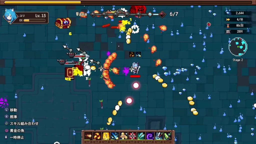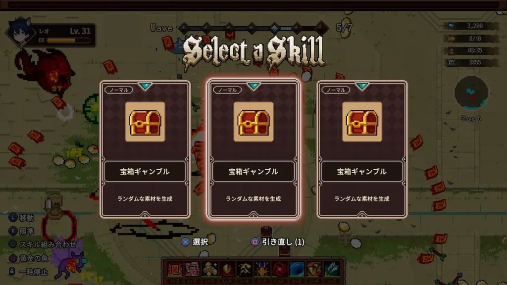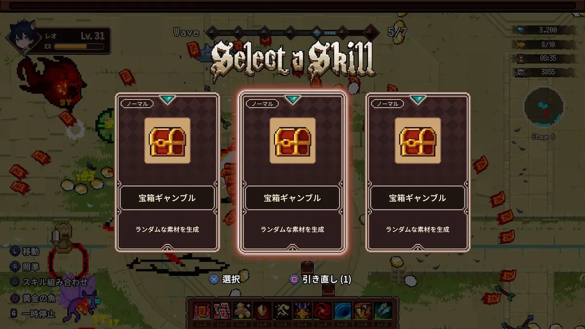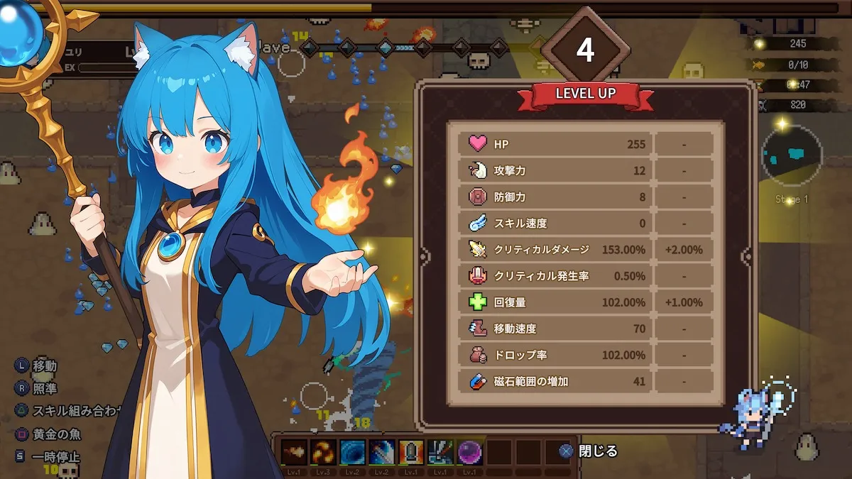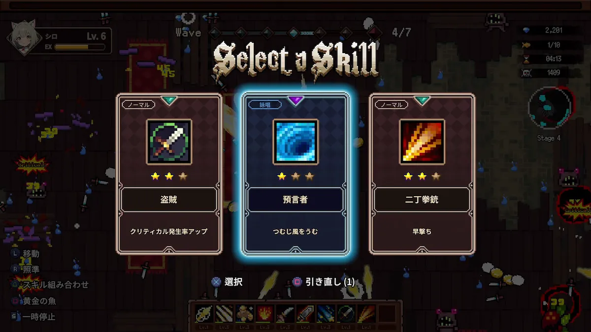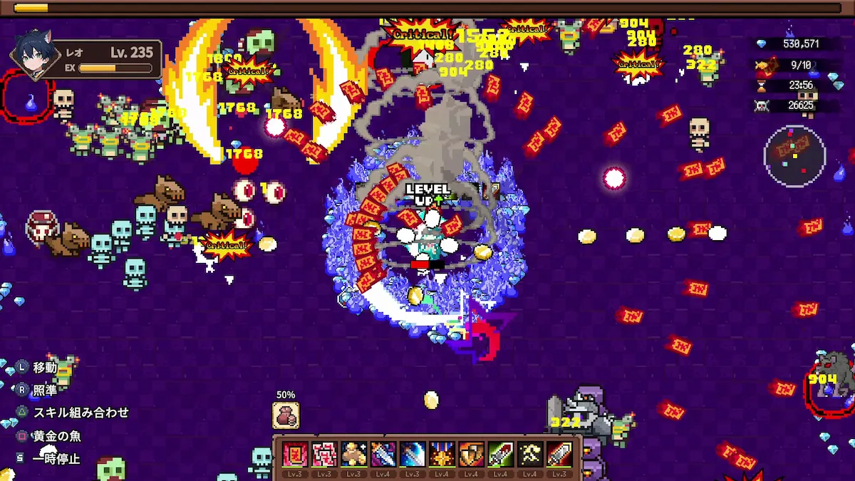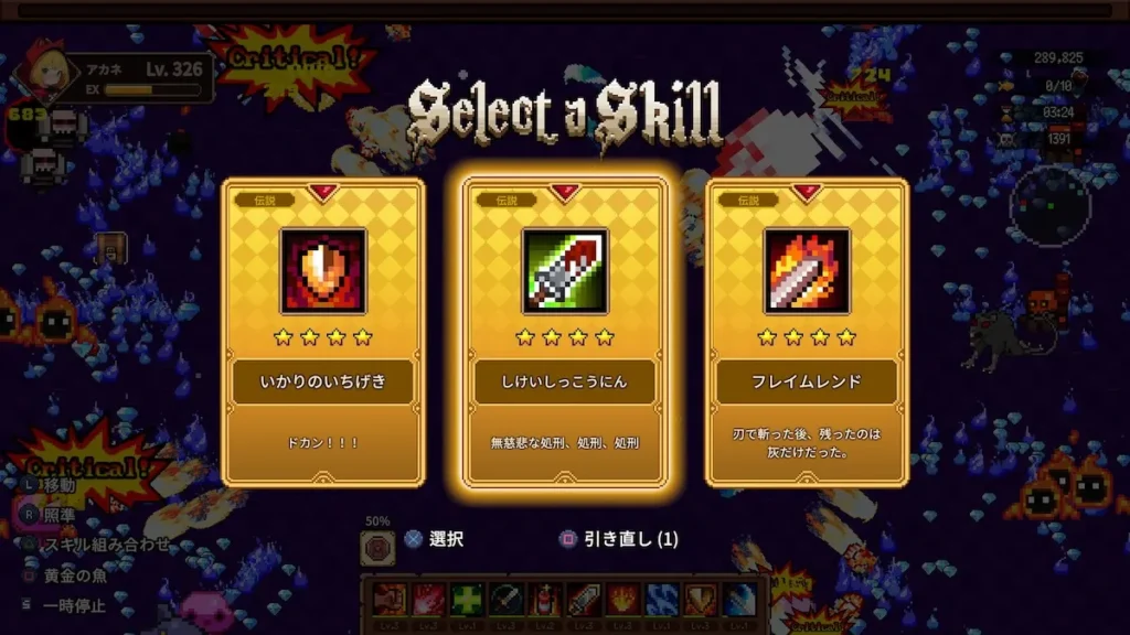 スキルと呼ばれる攻撃は自動で行われます。また、照準の操作をすると、任意の方向に攻撃ができるものもあります。敵を倒すと出現する青い火の玉みたいなものを拾うと、画面上部の黄色いゲージが溜まっていき、最大になると新たにランダム3択のスキルを選んで取得できます。また、毎回1度は引き直しも可能です。スキルの枠は10個あり、うち2つは、はじめからセットされているキャラクター固有のものとなっています。すべてのスキルは並列で発動し、独立したクールタイムが終わるたびに攻撃が行われます。なお、取得したスキルはステージが終了するとリセットされます。