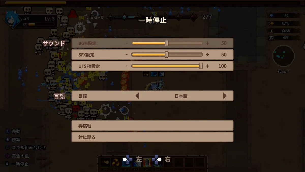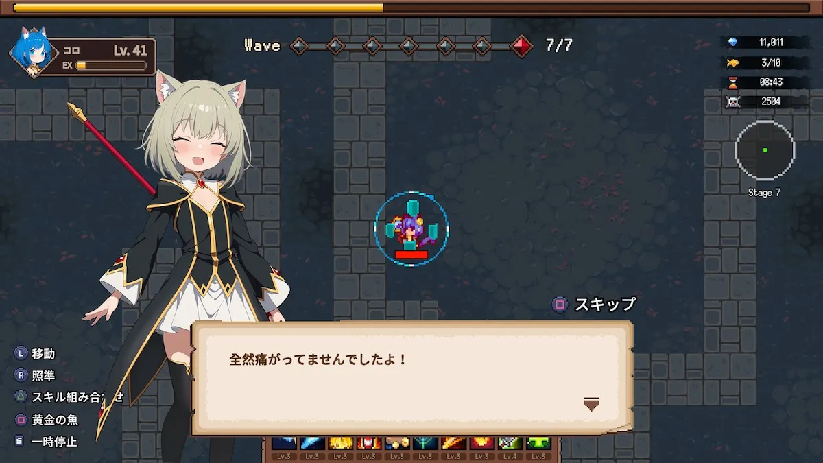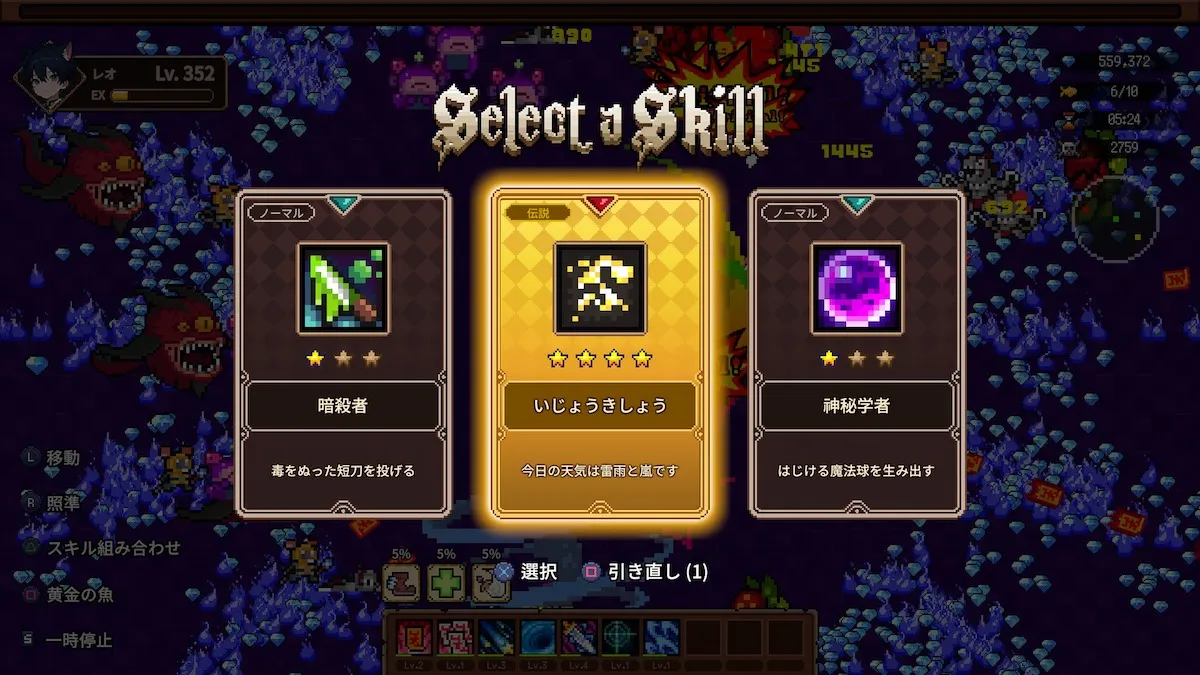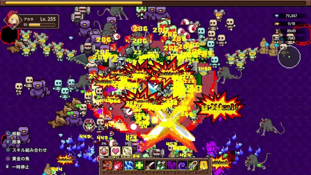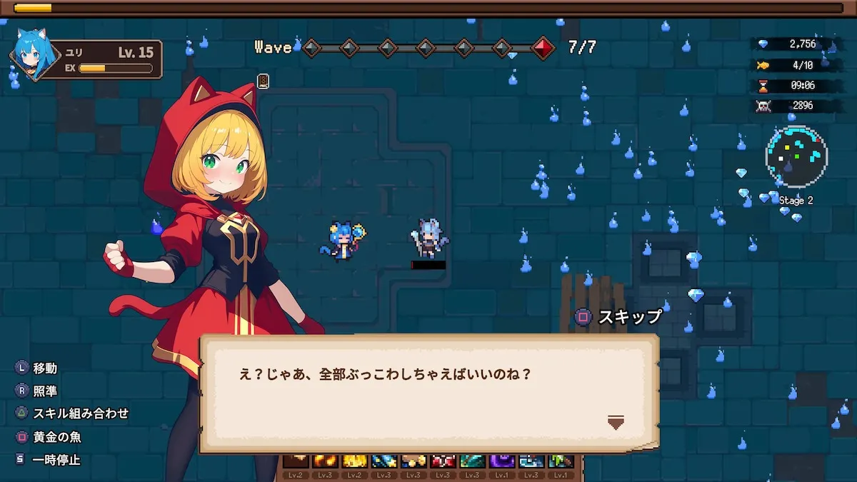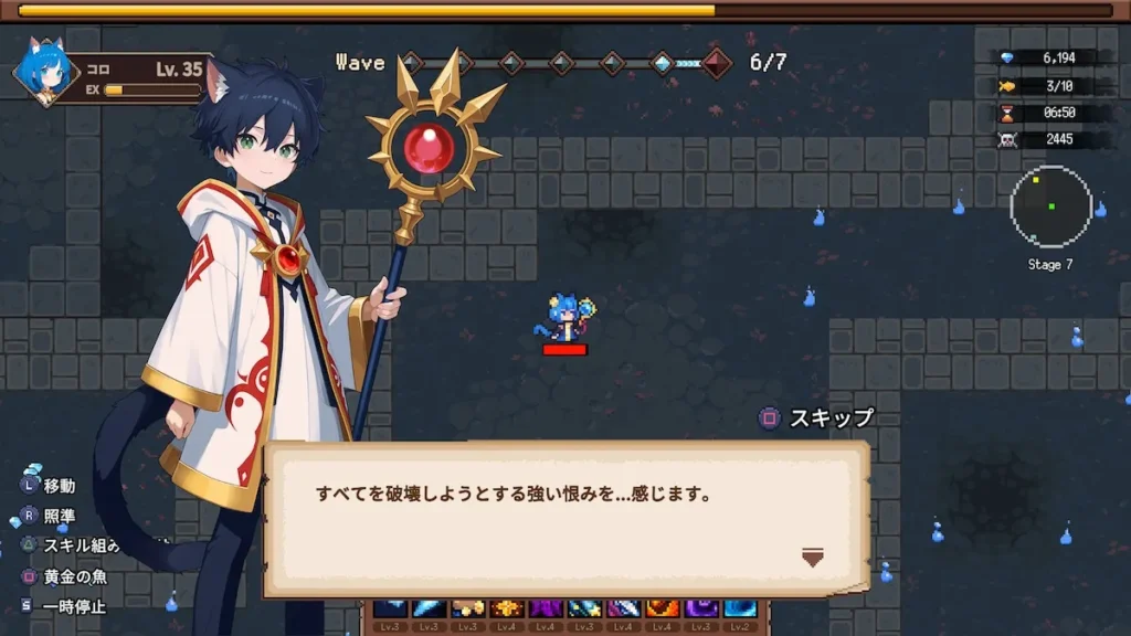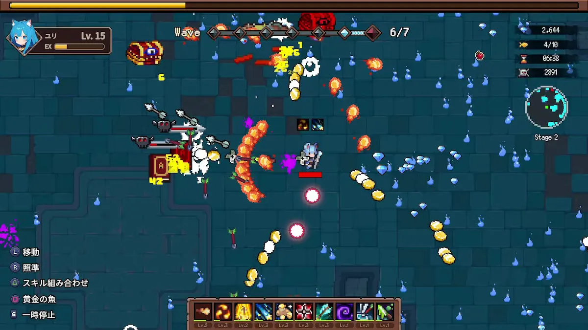 スキルと呼ばれる攻撃は自動で行われます。また、照準の操作をすると、任意の方向に攻撃ができるものもあります。敵を倒すと出現する青い火の玉みたいなものを拾うと、画面上部の黄色いゲージが溜まっていき、最大になると新たにランダム3択のスキルを選んで取得できます。また、毎回1度は引き直しも可能です。スキルの枠は10個あり、うち2つは、はじめからセットされているキャラクター固有のものとなっています。すべてのスキルは並列で発動し、独立したクールタイムが終わるたびに攻撃が行われます。なお、取得したスキルはステージが終了するとリセットされます。