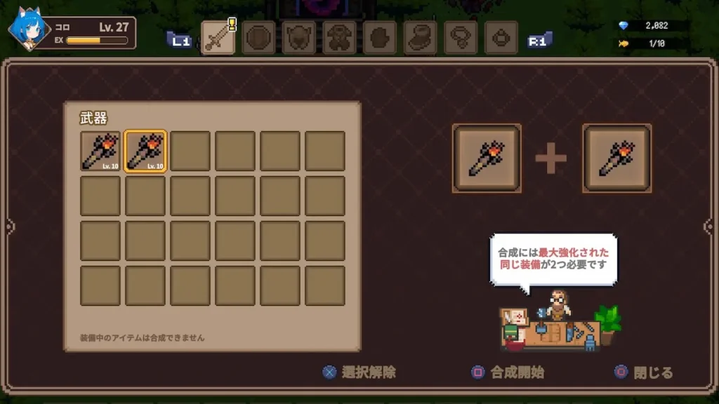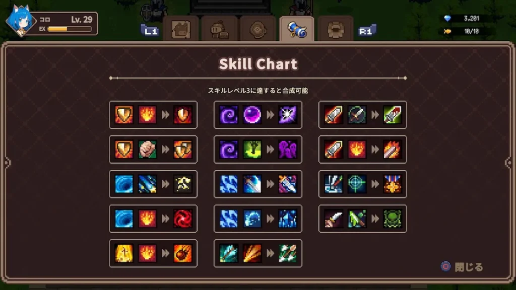 同じスキルを重ねて取得すると、該当スキルのレベルが上がり強化されます。また、特定の組み合わせのレベル3スキルを揃えると、新たなスキルの選択肢にレベル4スキルが出現します。この仕組みを合成と呼びます。合成後のスキルを取得した場合、元となったレベル3スキルは消滅します。なので、合成でスキル欄を圧縮しつつ、空いた枠でまた合成の組み合わせとなるスキルを取っていくというのが、強力なスキルを揃えるコツなのだと思います。とはいえ、スキルの種類や合成のパターンもそこまで多くないので、取るものさえ決めておけば、大体毎回同じ動きができます。