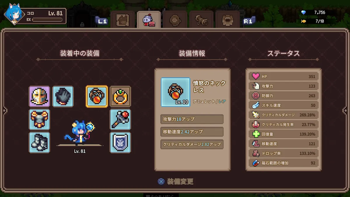 装備スロットは8つの部位に分かれています。装備アイテムはベースとなる性能に加えて、レベル、2〜4枠目にはレアリティに応じてランダムなステータスアップ効果が付与されているものがあります。装備の入手方法は、店売りかステージ中でのドロップです。ドロップ限定の装備もあり、こういうのが拾えるとちょっと嬉しい。たぶん絵がついているのがよいのだと思います。