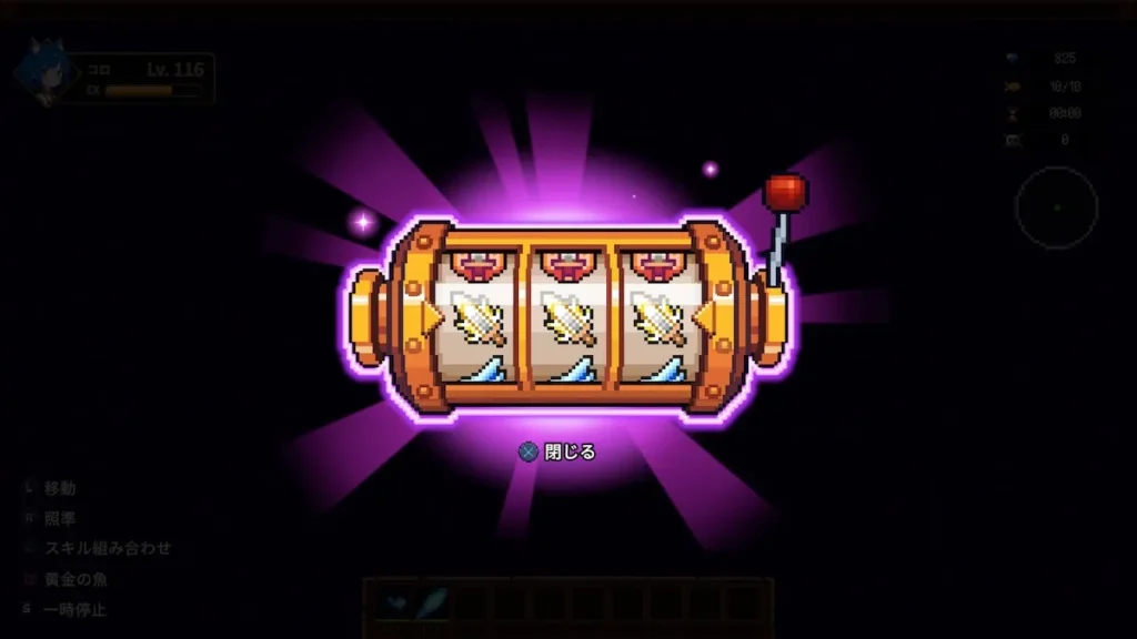 開始時には、スロットマシンのスピンがあります。揃った絵柄に応じて、ステータスにボーナス効果がかかるようです。この仕組みにどのような狙いがあるのかは、よくわからなかったけれど。