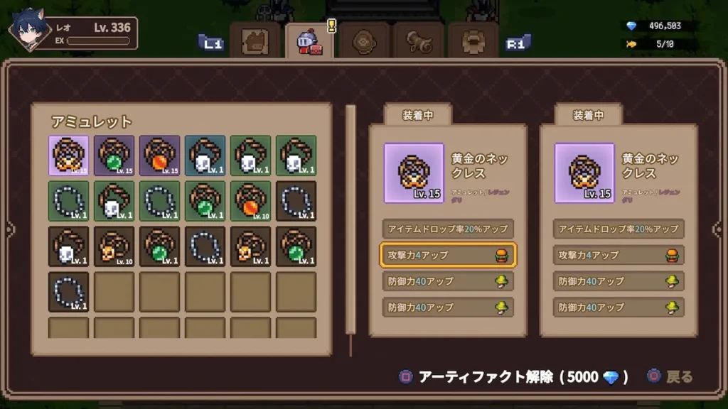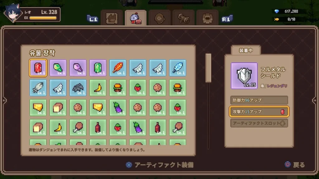 遺物は、おそらくドロップのみでの入手です。10個まで装備でき、レアリティや種類によって影響するステータスや効果値に差があります。付け替えは自由にできますが、装備しているかどうかが非常に分かりづらいメニュー画面です。当たり前ですが、装備をしていない遺物の効果は発動していないので気をつけよう。僕はほぼクリア直前まで気付けませんでした。