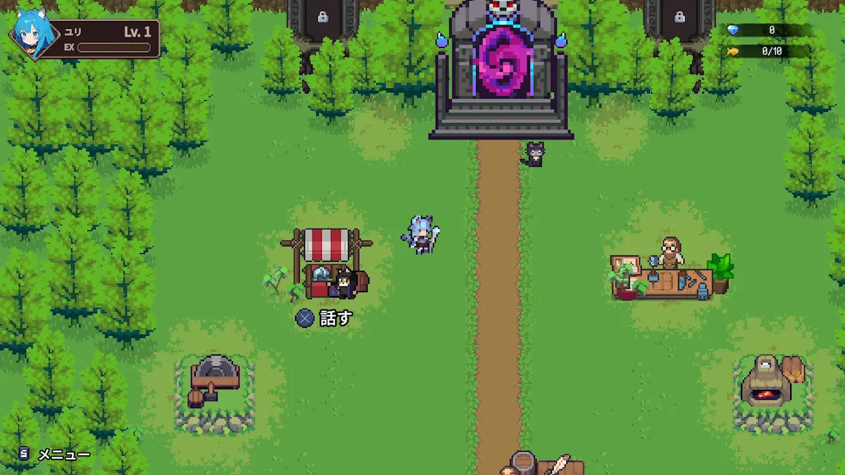 ゲーム開始後は、簡単な導入部の後、こういう作品でありがちな最低限の機能を持った拠点に放り込まれます。ゲームの流れとしては、ステージ中で獲得したダイヤを使用して、拠点でプレイヤーの強化を行うことの繰り返しです。準備ができたら拠点上部にある門から出撃しよう。